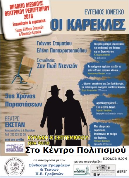 «Οι καρέκλες» το αριστούργημα του Ιονέσκο από το θέατρο ΕΚΣΤΑΝ σε συνεργασία με τον ΣΥΝΔΕΣΜΟ ΓΡΑΜΜΑΤΩΝ ΚΑΙ ΤΕΧΝΩΝ Π.Ε. ΓΡΕΒΕΝΩΝ την Κυριακή 8 Σεπτεμβρίου στο Κέντρο Πολιτισμού του Δήμου Γρεβενών.