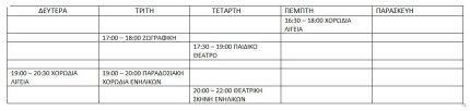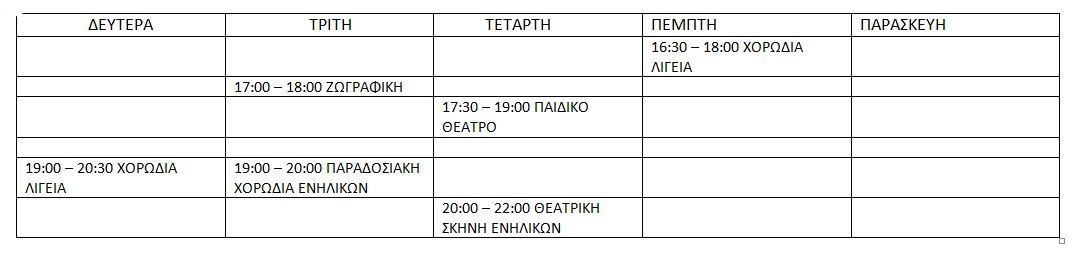 4 τμήματα ενηλίκων (χορωδία Λίγεια, παραδοσιακή Χορωδία, Ζωγραφική και Θεατρική Σκηνή Ενηλίκων) και ένα παιδικό τμήμα (Παιδικό Θέατρο) τις ώρες που αναγράφονται στο παρακάτω πρόγραμμα: