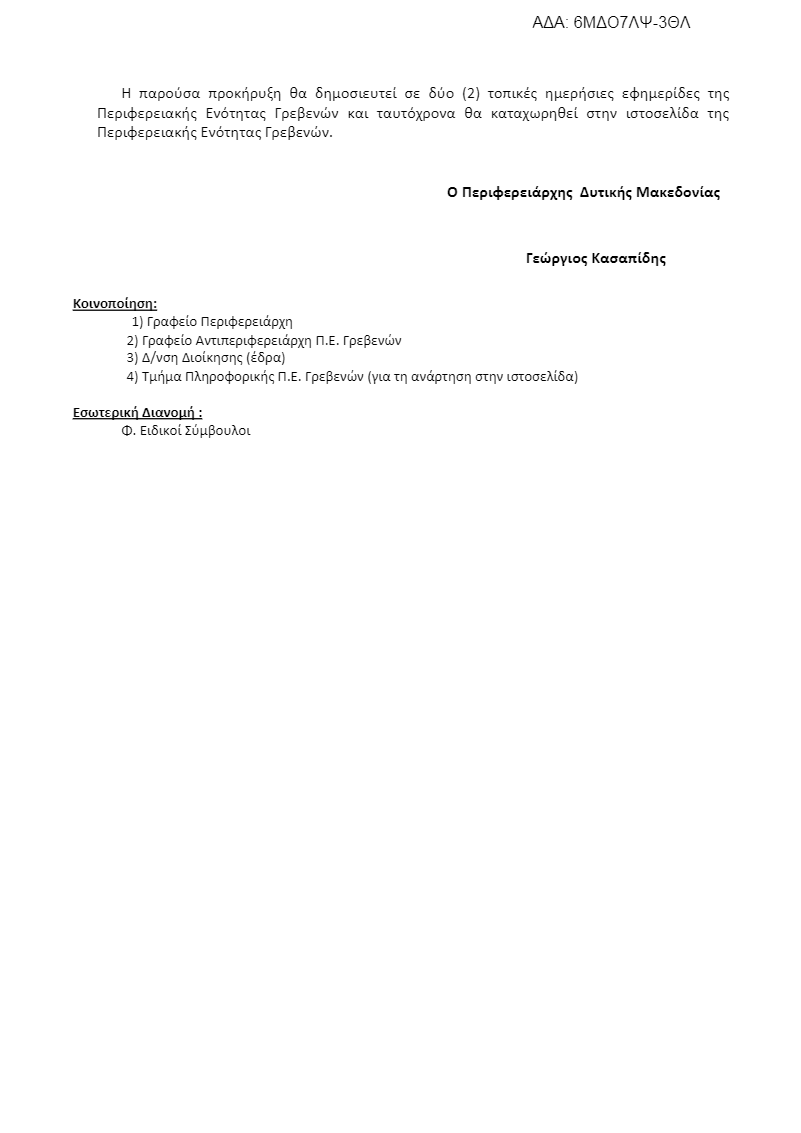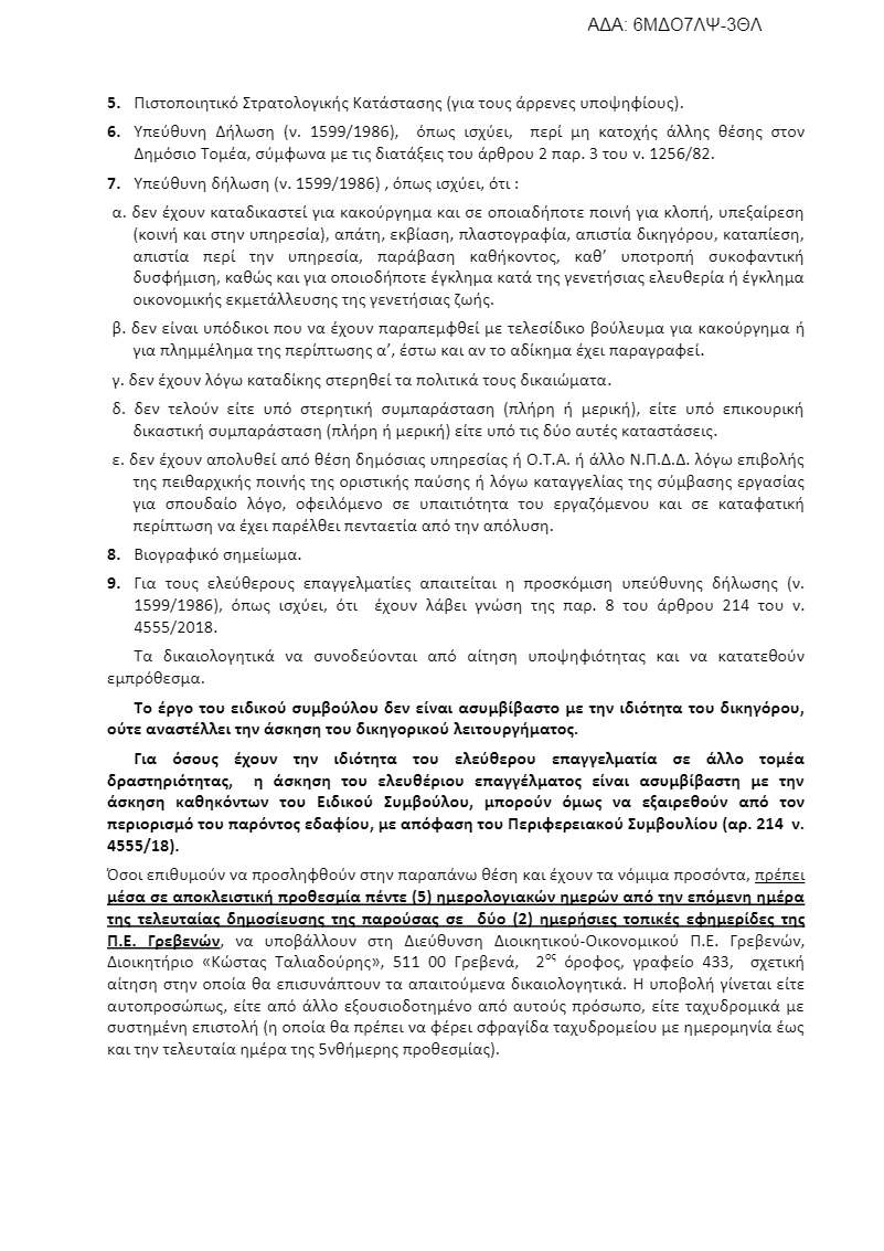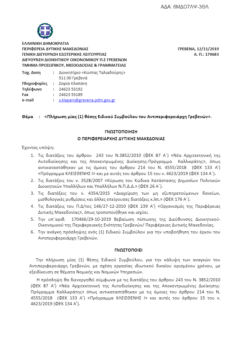 Την πλήρωση μίας (1) θέσης Ειδικού Συμβούλου, για την κάλυψη των αναγκών του Αντιπεριφερειάρχη Γρεβενών, με σχέση εργασίας ιδιωτικού δικαίου ορισμένου χρόνου, με εξειδίκευση σε θέματα Νομικής και Νομικών Υπηρεσιών.