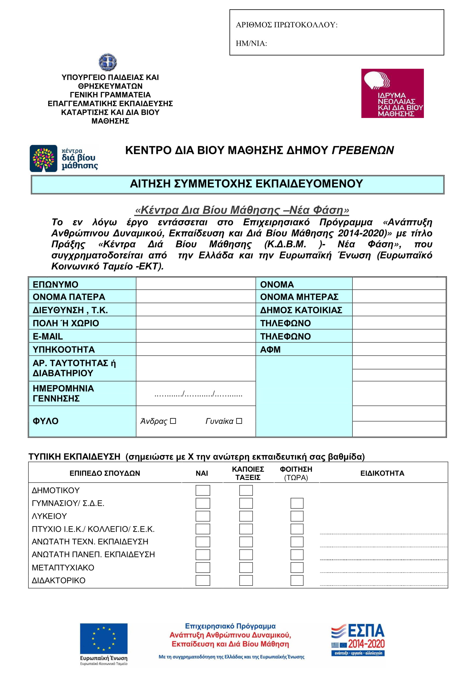 Ενημερώνουμε κάθε ενδιαφερόμενο/η ότι ο Δήμος Γρεβενών, το Υπουργείο Παιδείας και Θρησκευμάτων (διά της Γενικής Γραμματείας Επαγγελματικής Εκπαίδευσης, Κατάρτισης και Διά Βίου Μάθησης) και το Ίδρυμα Νεολαίας και Διά Βίου Μάθησης συνεχίζουν επιτυχώς τη λειτουργία του Κ.Δ.Β.Μ. του Δήμου Γρεβενών στο οποίο θα υλοποιηθούν προγράμματα Γενικής Εκπαίδευσης Ενηλίκων με εκπαιδευτικές δράσεις Εθνικής και Τοπικής Εμβέλειας.