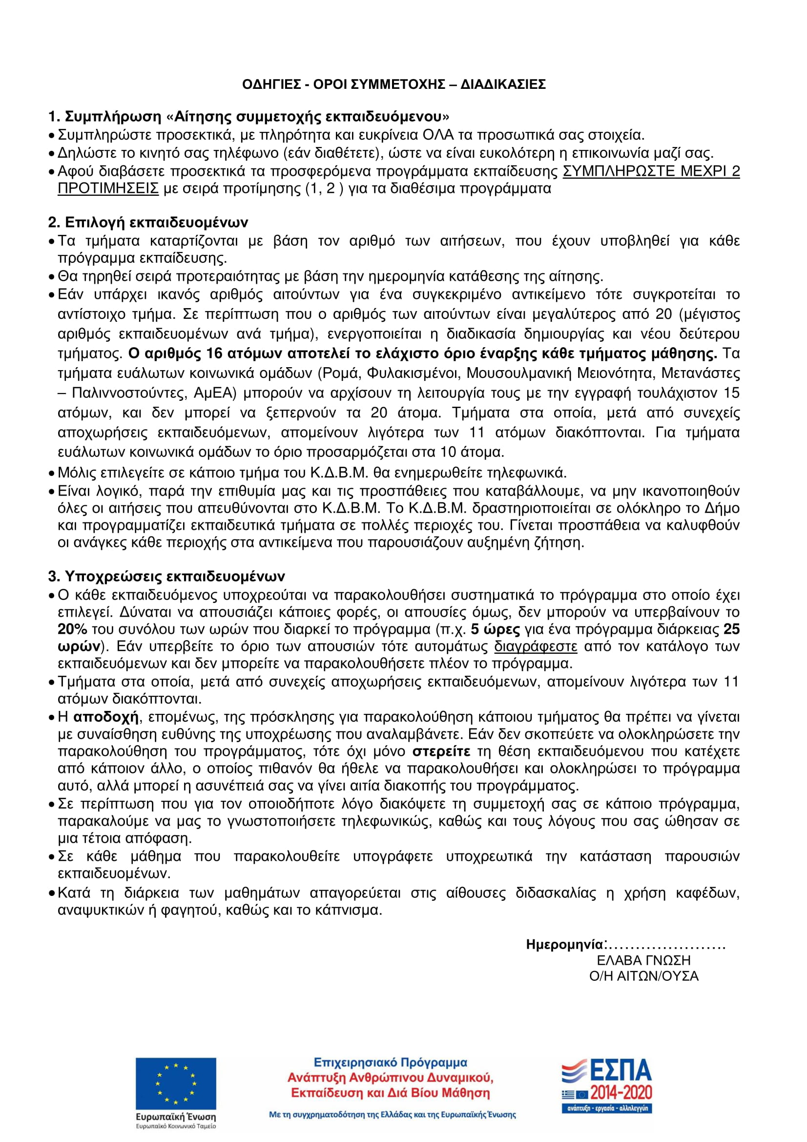 Τα προσφερόμενα προγράμματα μπορούν να παρακολουθήσουν ενήλικες ανεξαρτήτως χώρας καταγωγής, ηλικίας και μόρφωσης, καθώς και μέλη ευάλωτων κοινωνικά ομάδων. Για την ένταξη των ενδιαφερομένων στα τμήματα απαιτείται η συμπλήρωση σχετικής αίτησης με επίδειξη του δελτίου αστυνομικής ταυτότητας ή του διαβατηρίου του υποψήφιου.