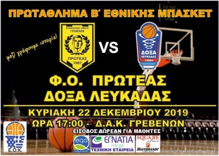 Την Α.Ε.Δόξα Λευκάδας θα αντιμετωπίσει ο Φ.Ο.Πρωτέας Γρεβενών, την Κυριακή 22-12-2019 & ώρα 17:00 στο ΔΑΚ Γρεβενών στο πλαίσιο της 12ης αγωνιστικής του Πρωταθλήματος της Β΄Εθνικής Ανδρών, με την νίκη να αποτελεί μονόδρομο για την ομάδα των Γρεβενών.