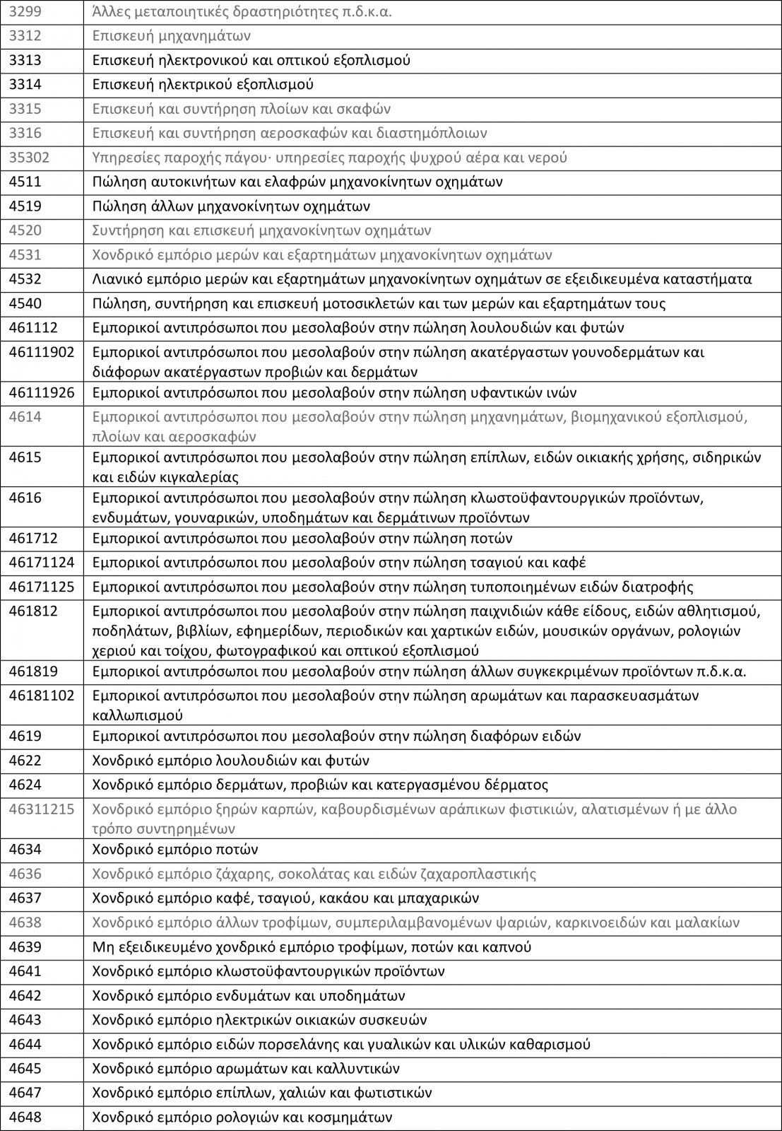 Αναλυτικά οι ΚΑΔ που πλήττονται είναι οι εξής (με γκρι χρώμα επισημαίνονται οι κατηγορίες που προστίθενται):