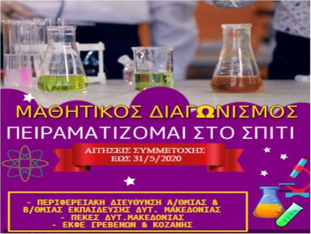 Η Περιφερειακή Διεύθυνση Εκπαίδευσης Δυτικής Μακεδονίας, το ΠΕΚΕΣ Δυτικής Μακεδονίας και τα ΕΚΦΕ Γρεβενών και Κοζάνης στο πλαίσιο της ανάγκης για δημιουργική απασχόληση των παιδιών στο σπίτι προκηρύσσουν Μαθητικό Διαγωνισμό Φυσικών Επιστημών με τίτλο «Πειραματίζομαι στο σπίτι».