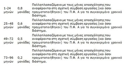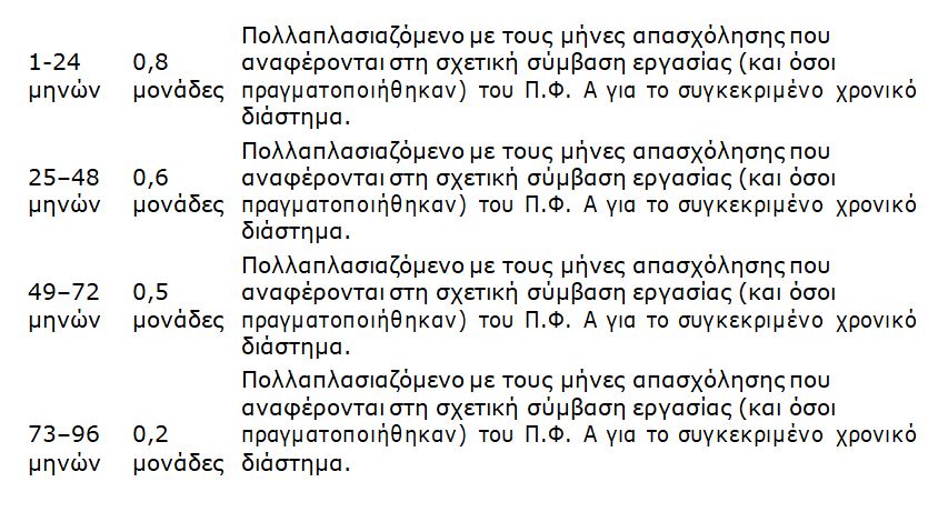 Για κάθε μήνα αποδεδειγμένης απασχόλησης στα Π.Α.γ.Ο. οι μονάδες που λαμβάνονται υπολογίζονται κλιμακωτά ως εξής: