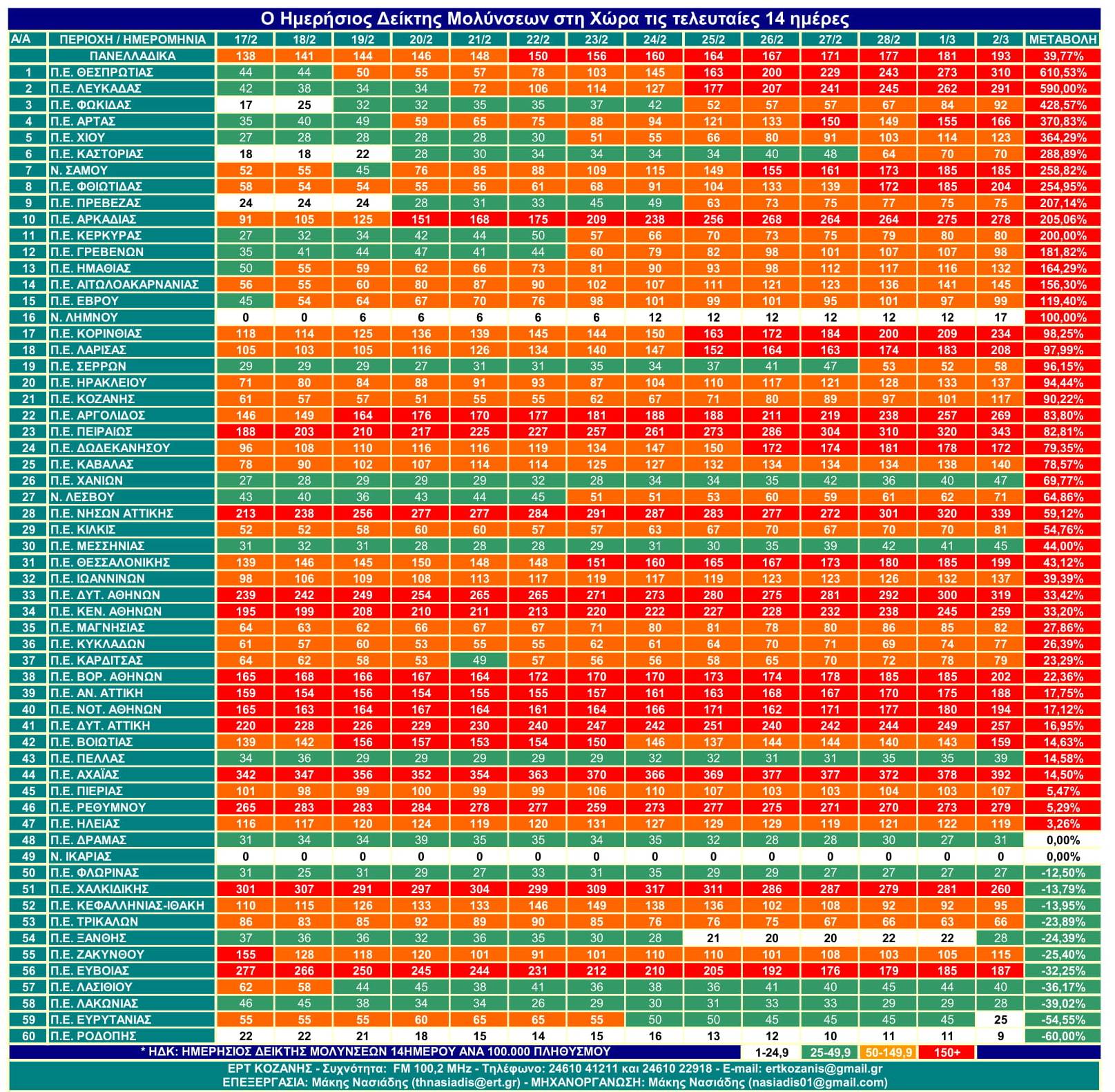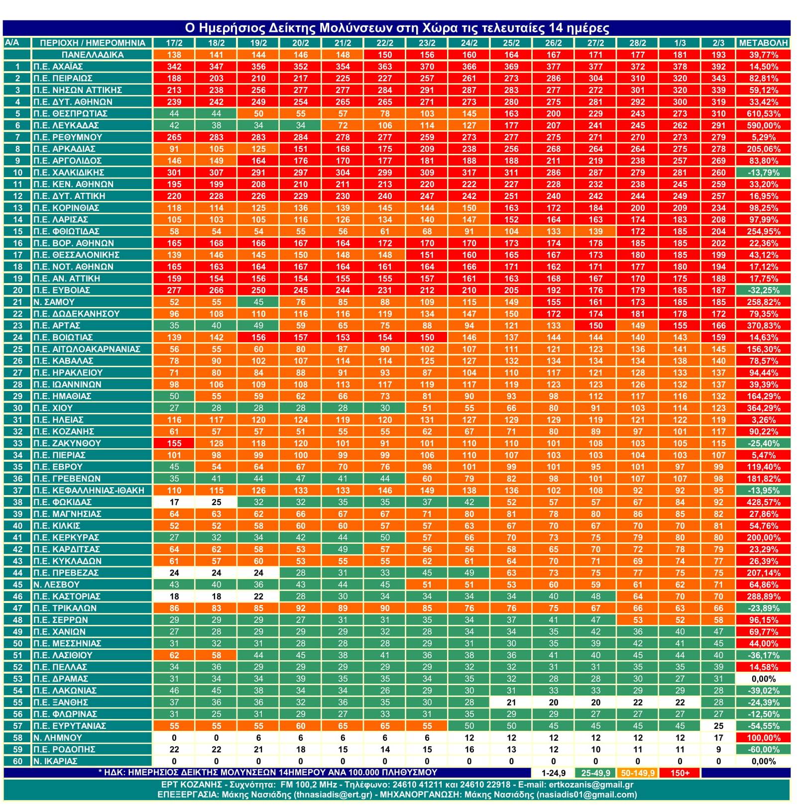 Σήμερα Πανελλαδικά ο Δείκτης ανέβηκε στο 193 από 138 που ήταν στις 18 του Φλεβάρη. Δηλαδή είναι αναλογικά 193 άτομα ανά 100.000 κατοίκους στις τελευταίες 14 ημέρες και η αύξηση είναι 39,77%…