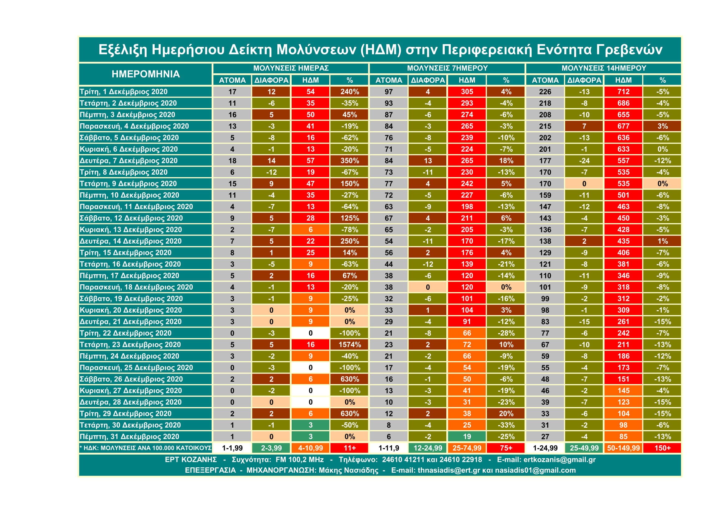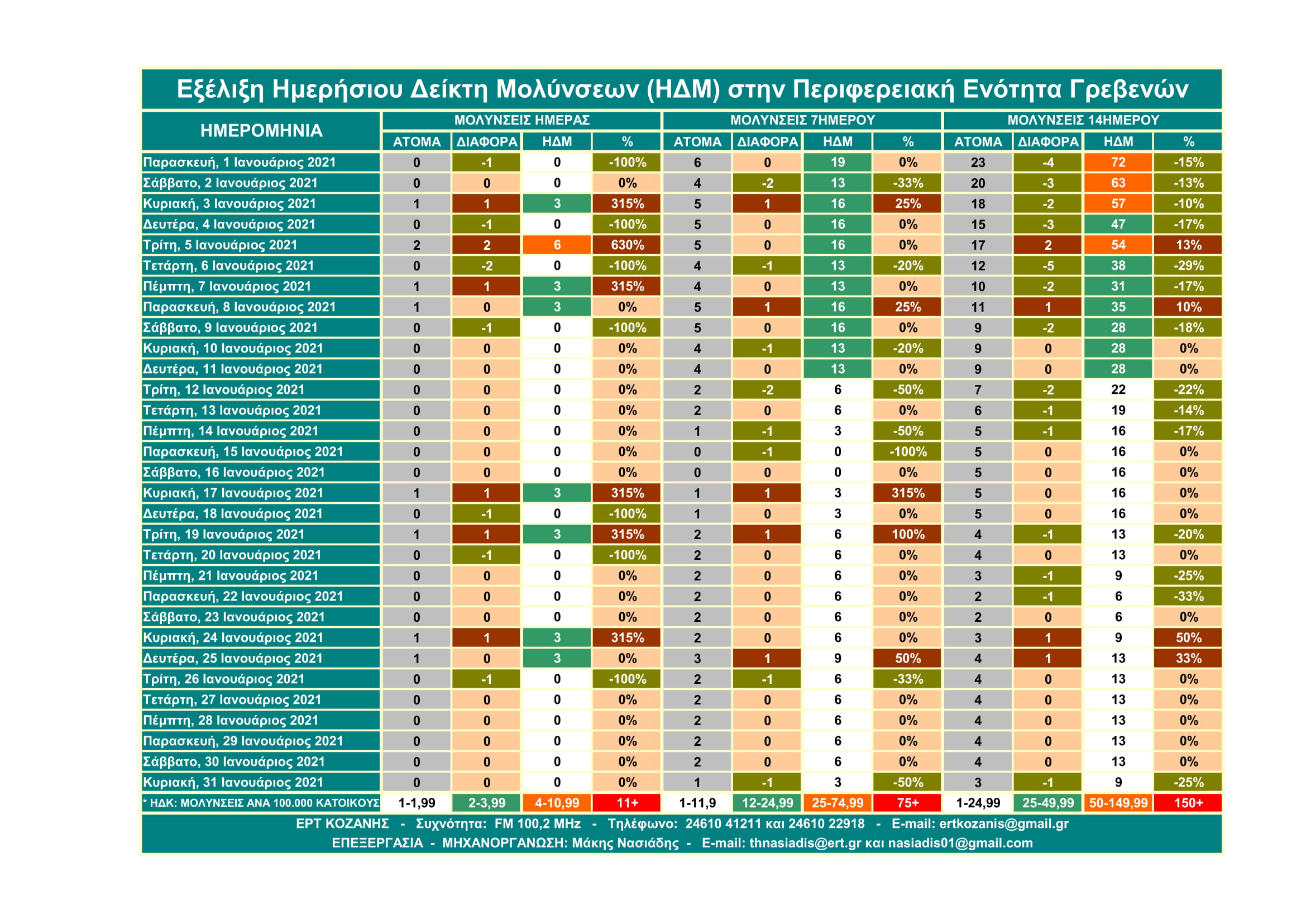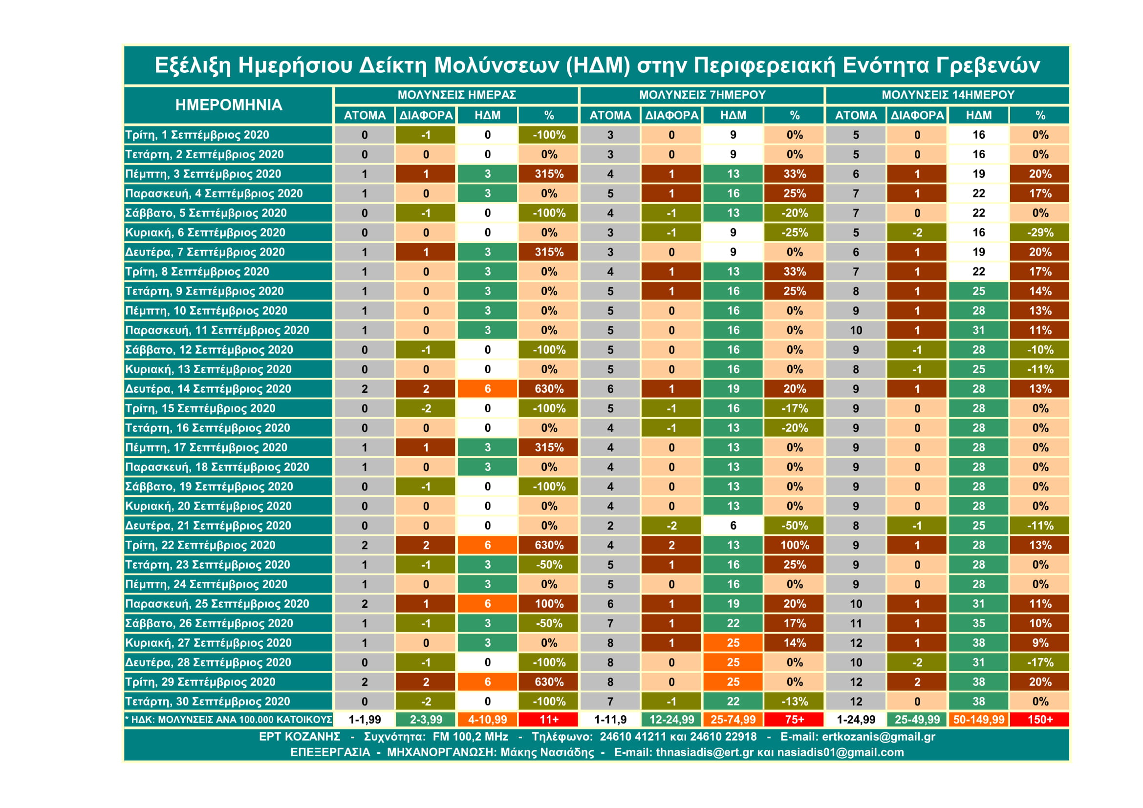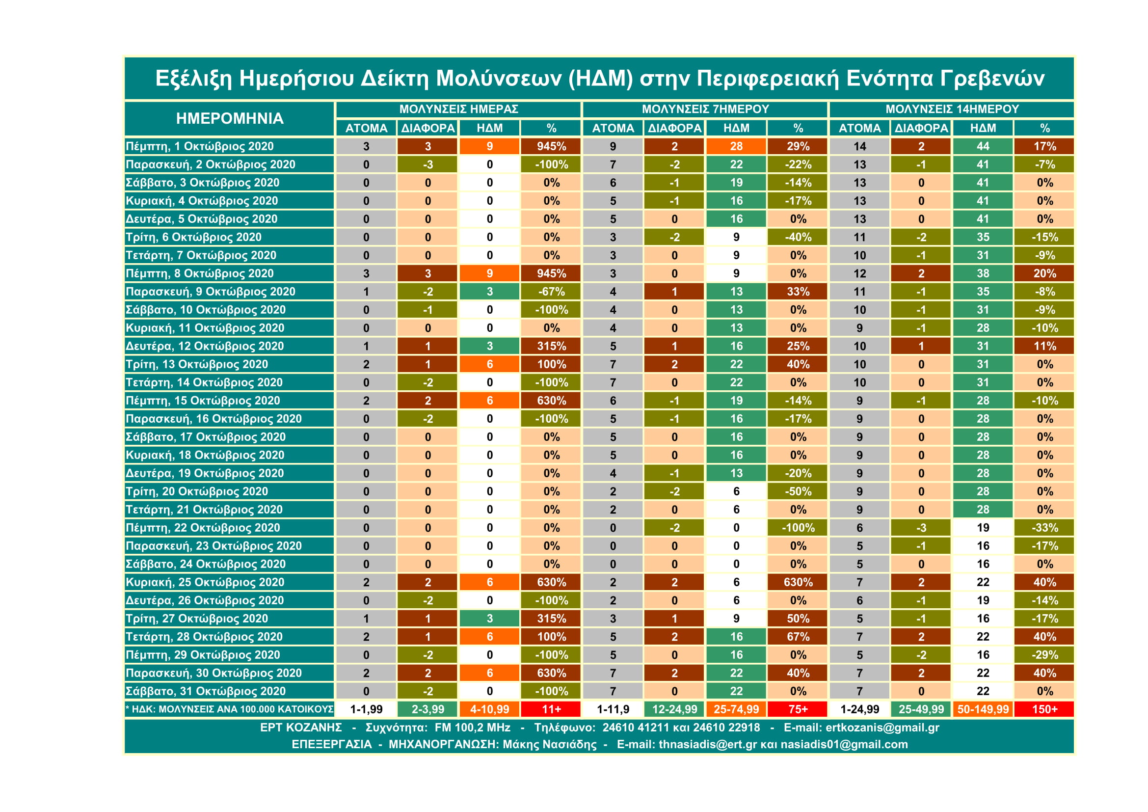 Μην σας κάνουν εντύπωση τα υψηλά ποσοστά γιατί αυτά αφορούν τον Ημερήσιο Δείκτη Μολύνσεων ανά 14ήμερο και σε αναλογία 100.000 κατοίκων και όχι τις μολύνσεις. Η σημασία του έχει να κάνει με την επιθετικότητα ή μη που έχει ο SARS-COV 2 βάσει του πληθυσμού κάθε Περιφερειακής Ενότητας.