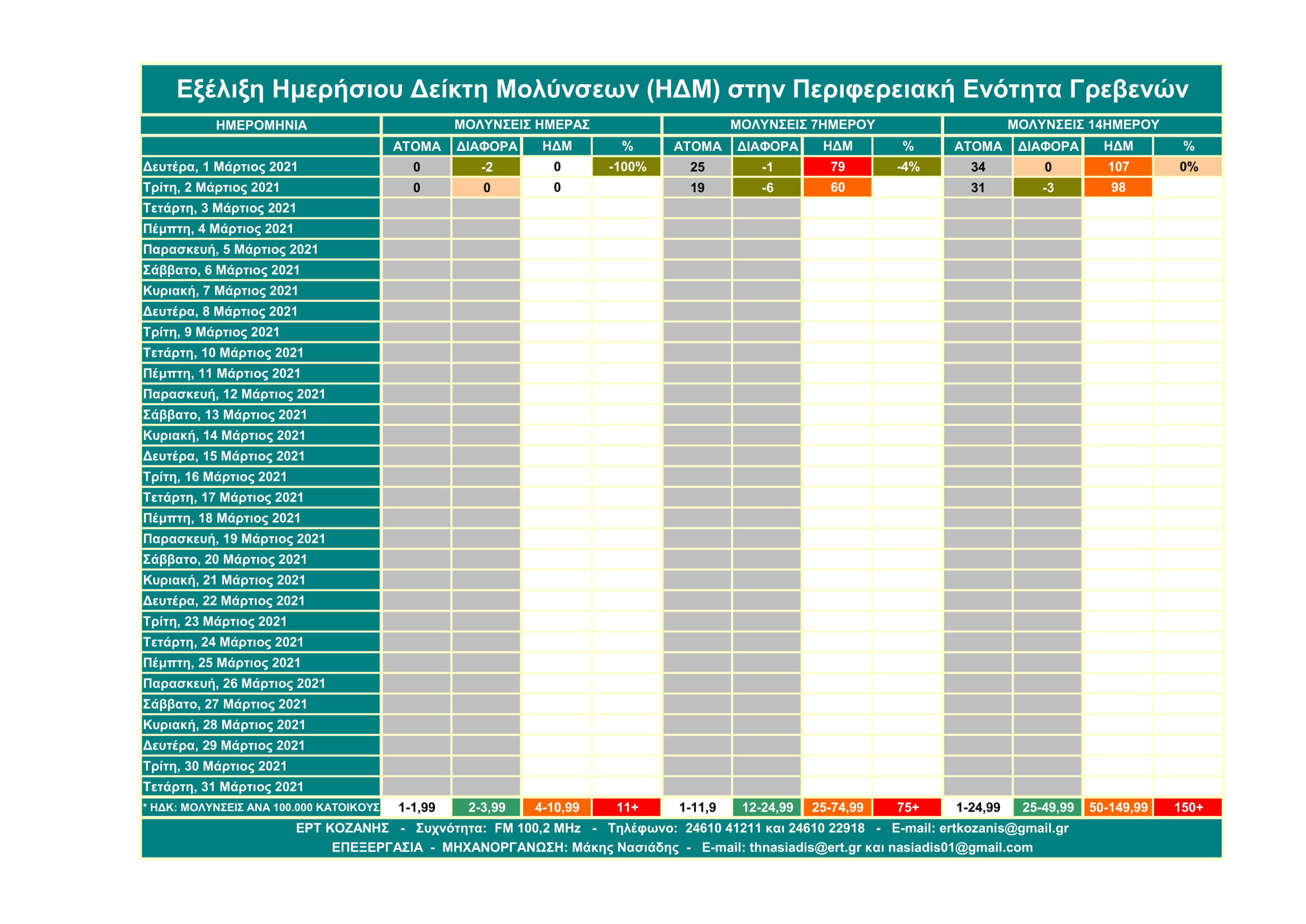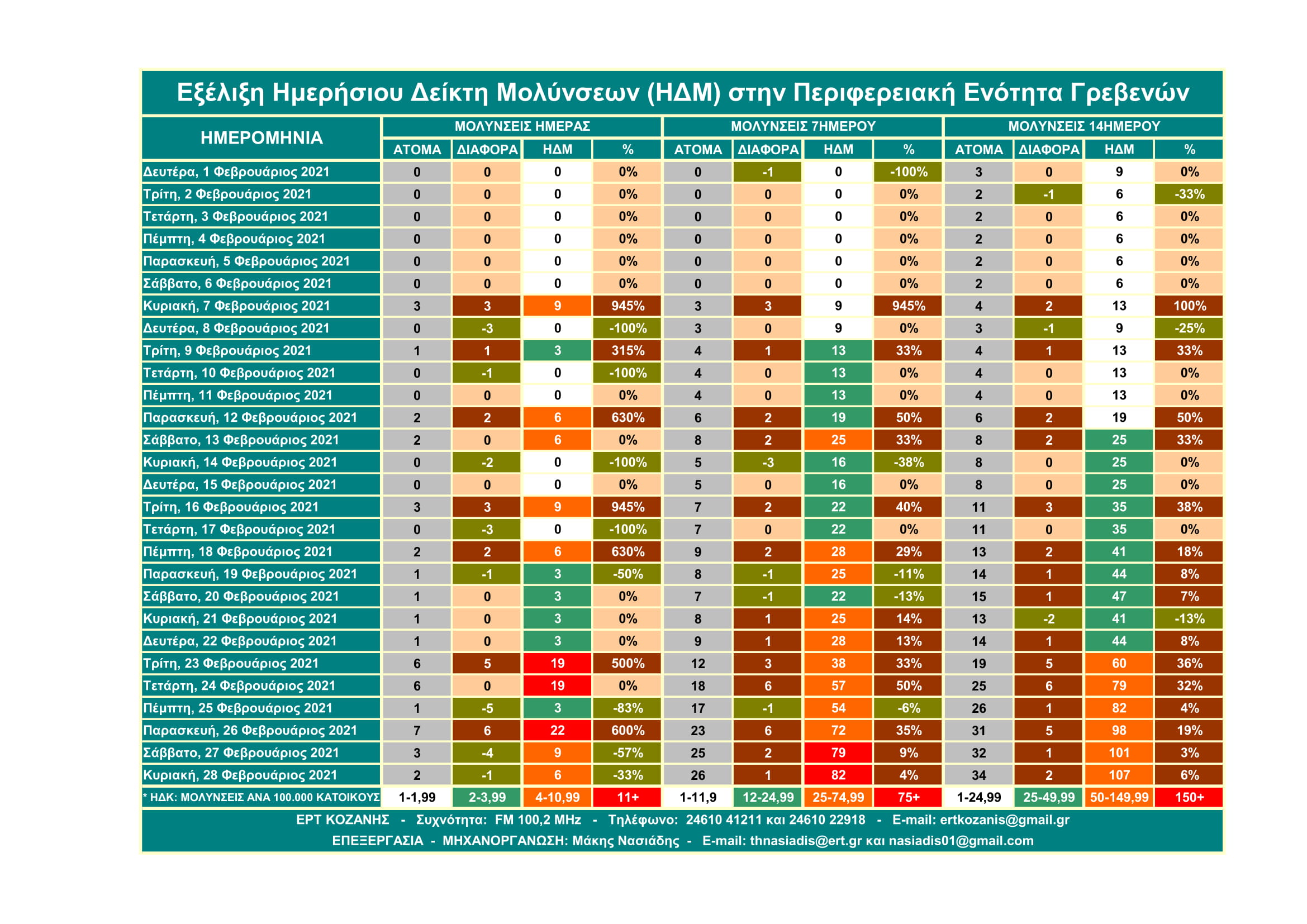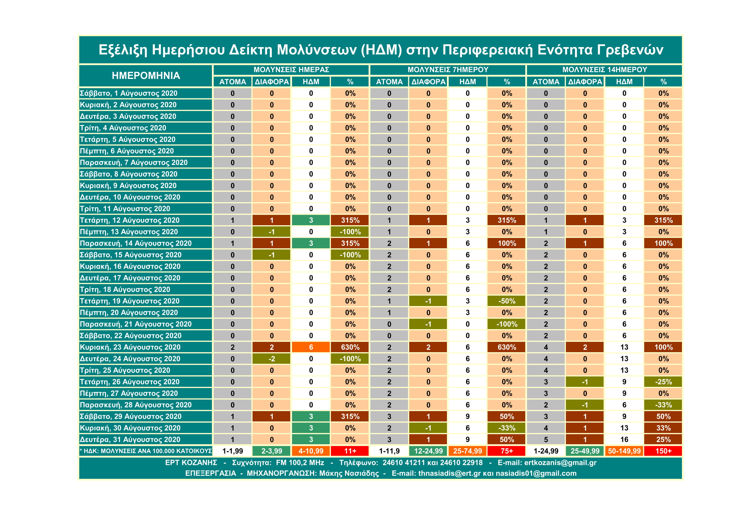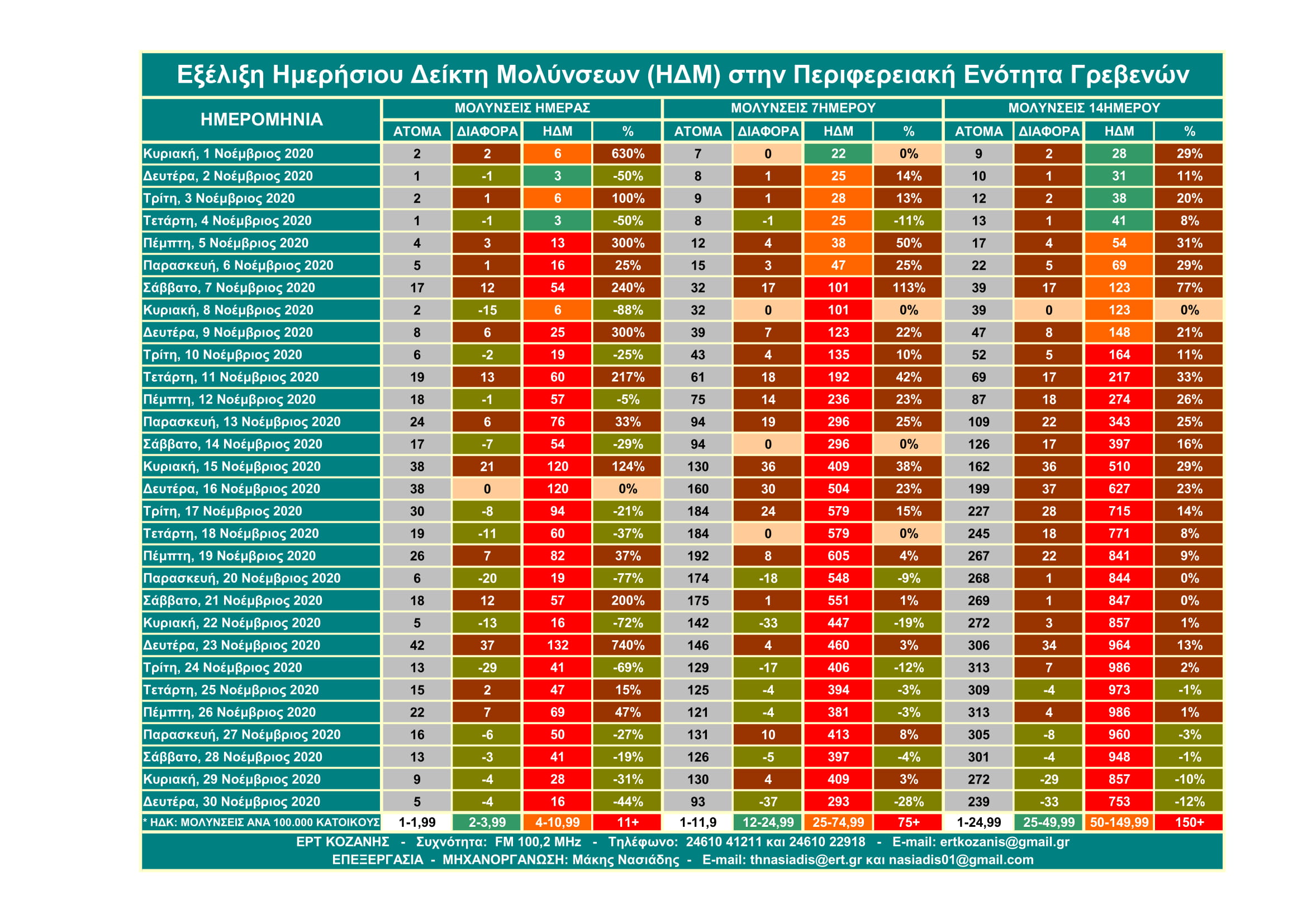 Μην σας κάνουν εντύπωση τα υψηλά ποσοστά γιατί αυτά αφορούν τον Ημερήσιο Δείκτη Μολύνσεων ανά 14ήμερο και σε αναλογία 100.000 κατοίκων και όχι τις μολύνσεις. Η σημασία του έχει να κάνει με την επιθετικότητα ή μη που έχει ο SARS-COV 2 βάσει του πληθυσμού κάθε Περιφερειακής Ενότητας.