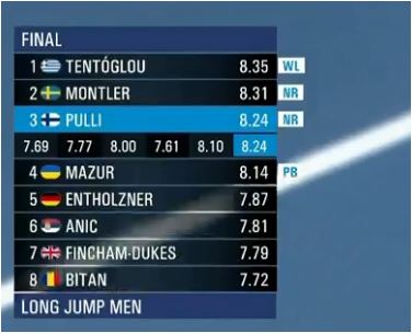 Δεν μπήκε στη 2η και την 3η προσπάθεια για να προφυλάξει το πόδι του καθώς πηδούσε 8ος και είχε τον απόλυτο έλεγχο του αγώνα. Δοκίμασε στο 4ο και το 5ο ρισκάροντας αλλά δεν του βγήκε το πάτημα καθώς ήταν άκυρα. Τελικά το 8.35μ ήταν αρκετό παρά το γεγονός πως ο Τομπίας Μόντλερ έκανε τον αγώνα της ζωής του πηδώντας 8.31μ (εθνικό ρεκόρ Σουηδίας). Τρίτος με μεγάλο ατομικό ρεκόρ ο Φινλανδός Κρίστιαν Πούλι που είχε 7.83μ και τελείωσε τον αγώνα με 8.24μ που είναι και νέο εθνικό ρεκόρ!