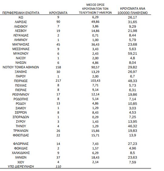 Με βάση τα επιβεβαιωμένα κρούσματα των τελευταίων 7 ημερών, 34 θεωρούνται σχετιζόμενα με ταξίδι από το εξωτερικό και 2.210 είναι σχετιζόμενα με ήδη γνωστό κρούσμα.