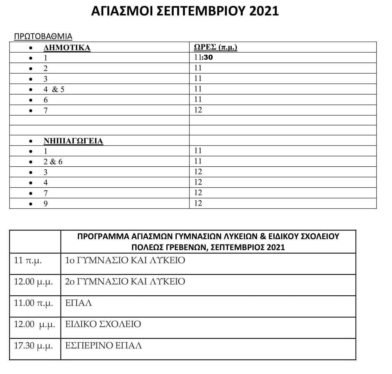 Σύμφωνα με την Μητρόπολη Γρεβενών, το πρόγραμμα των Αγιασμών όλων των σχολείων στα Γρεβενά, την Δευτέρα 13 Σεπτεμβρίου, έχει ως εξής:
