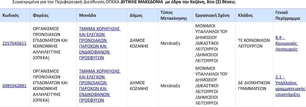 Ο Οργανισμός Προνοϊακών Επιδομάτων και Κοινωνικής Αλληλεγγύης ανακοινώνει πως αναρτήθηκαν στο Μητρώο Ανθρώπινου Δυναμικού του Ελληνικού Δημοσίου 24 κενές οργανικές θέσεις του ΟΠΕΚΑ για κάλυψη με μετάταξη, στο πλαίσιο του Β΄ κύκλου Κινητικότητας 2021. Οι κλάδοι προσωπικού και τα περιγράμματα θέσης βρίσκονται στην εν λόγω ηλεκτρονική εφαρμογή του Μητρώου.