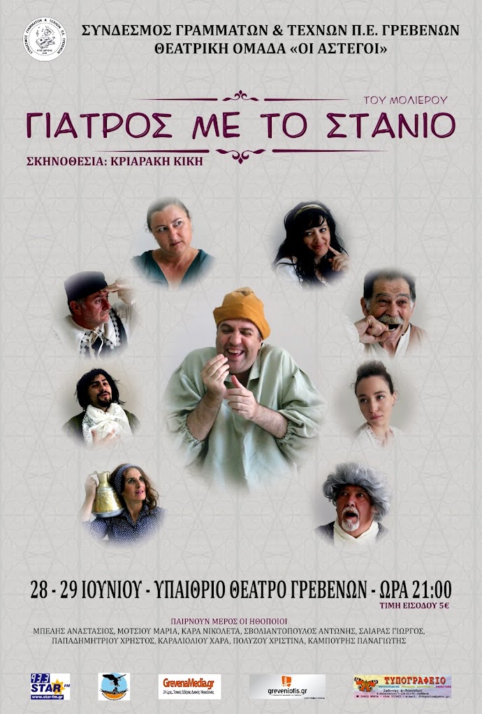 Η θεατρική ομάδα  “Οι Aστεγοι”  από τον Σύνδεσμο Γραμμάτων και Τεχνών Π.Ε Γρεβενών μας προσκαλεί στο υπαίθριο θέατρο των Γρεβενών στις 28 και 29 Ιουνίου στην παράσταση: ‘Γιατρός με το Στανιό’ σε σκηνοθεσία Κικής Κριαράκη.
