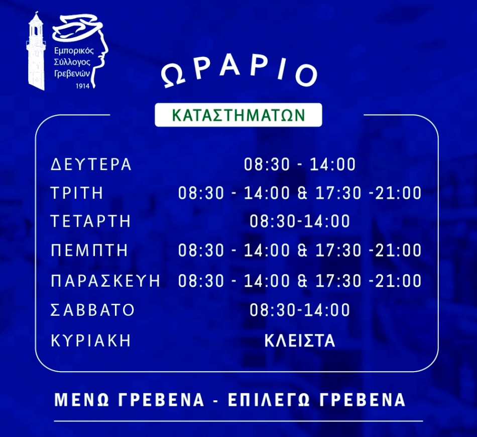 ΕΜΠΟΡΙΚΟΣ ΣΥΛΛΟΓΟΣ ΓΡΕΒΕΝΩΝ: Σε ισχύ το θερινό ωράριο λειτουργίας των καταστημάτων – (πίνακας) – STAR FM 933