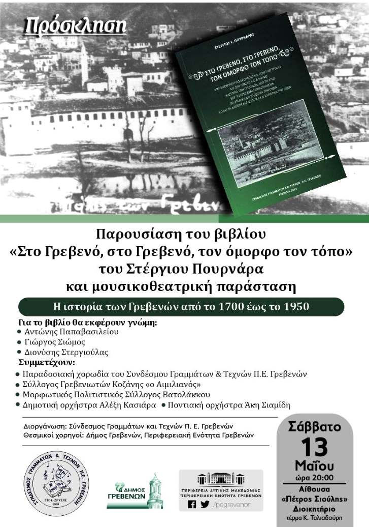«ΣΤΟ ΓΡΕΒΕΝΟ, ΣΤΟ ΓΡΕΒΕΝΟ, ΤΟΝ ΟΜΟΡΦΟ ΤΟΝ ΤΟΠΟ».Είχα τη χαρά, το βράδυ του Σαββάτου να παραβρεθώ σε μια, πραγματικά, αξιόλογη εκδήλωση, μια μουσικοθεατρική παράσταση γεμάτη Γρεβενά, που ζωντάνεψε επί σκηνής τη νεότερη ιστορία του τόπου μας από το 1700 μέχρι το 1950 και μας συγκίνησε όλους…Θα ήθελα να εκφράσω τα θερμά μου συγχαρητήρια στον Σύνδεσμο Γραμμάτων και Τεχνών της ΠΕ Γρεβενών για την άψογη διοργάνωση, σε όλους όσοι συμμετείχαν και στον Στέργιο Πουρνάρα για το βιβλίο του, που αποτελεί παρακαταθήκη, πηγή γνώσεων, αρχών και αξιών από το παρελθόν, για μια σωστή πορεία στο μέλλον.