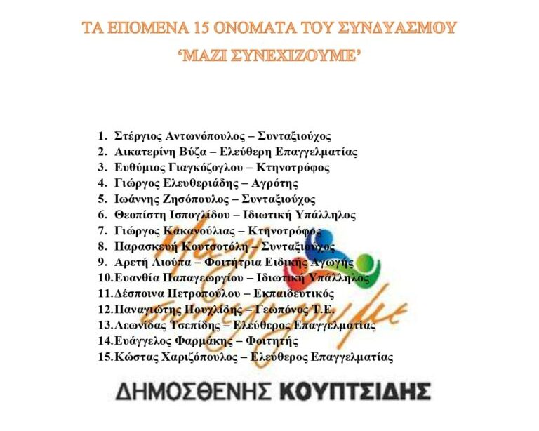 Μετά τους πρώτους υποψηφίους του Συνδυασμού “Μαζί Συνεχίζουμε” στον Δήμο Γρεβενών, που ανακοίνωσε σε συνέντευξη τύπου, το μεσημέρι του Σαββάτου (22-7), ο επικεφαλής του Συνδυασμού Δημοσθένης Κουπτσίδης, σήμερα σας παρουσιάζουμε άλλα 15 νέα ονόματα: