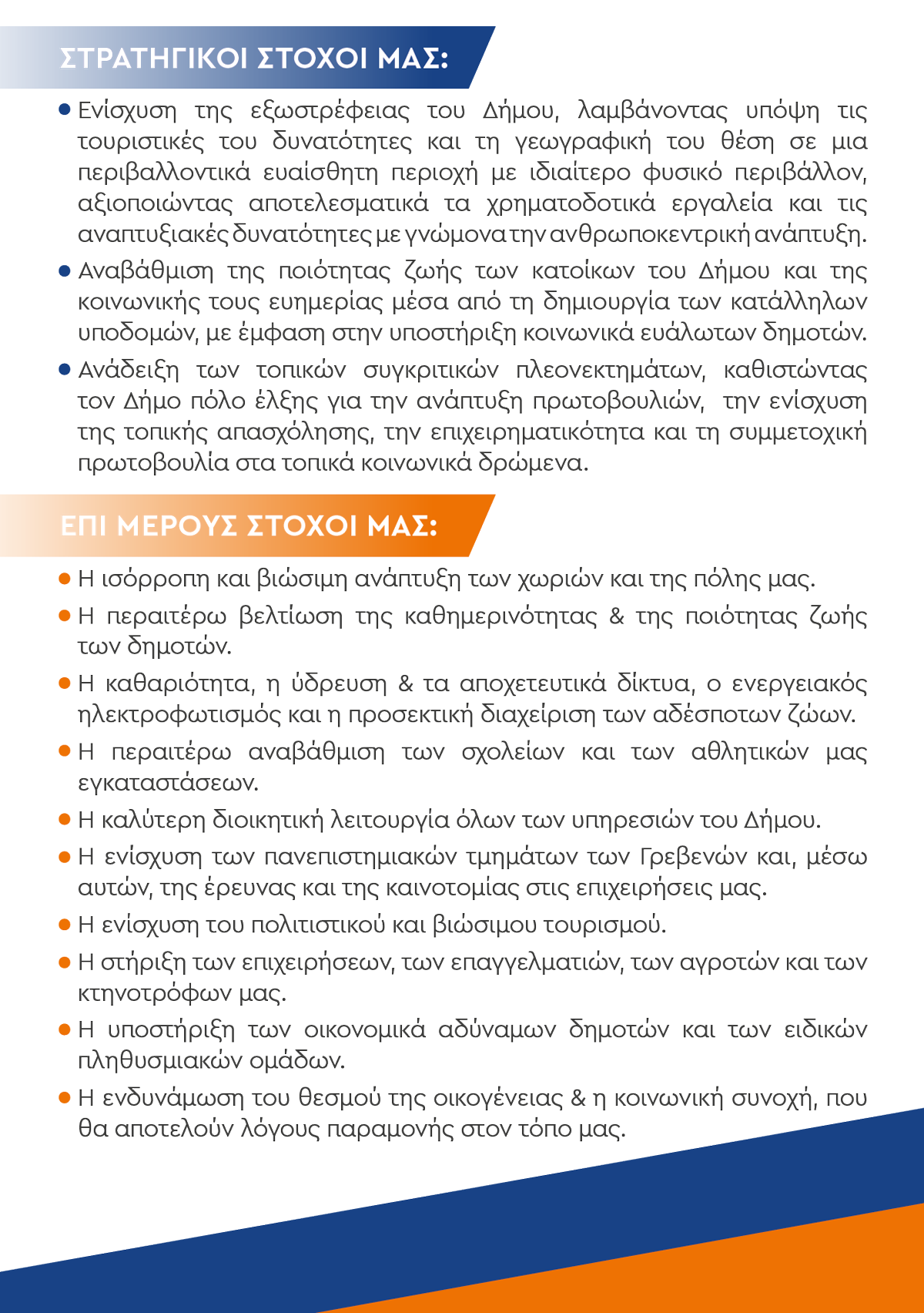 - Αξιοποίηση των διαθέσιμων αλλά και διεκδίκηση νέων πόρων για τον αστικό χώρο της πόλης σε ισορροπία με τα χωριά και τους ανθρώπους της υπαίθρου.