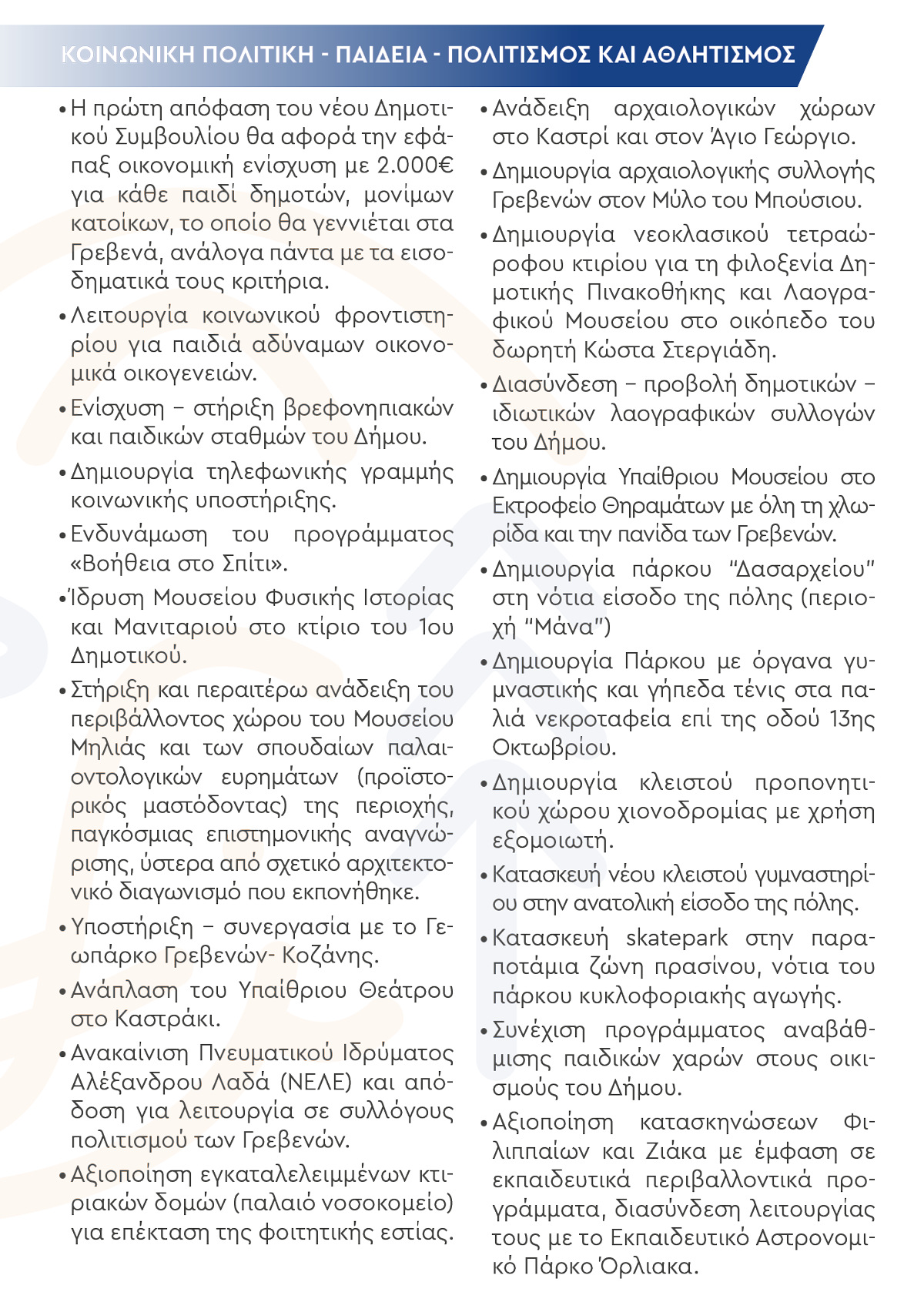 - Η πρώτη απόφαση του νέου Δημοτικού Συμβουλίου θα αφορά την εφάπαξ οικονομική ενίσχυση με 2.000€ για κάθε παιδί δημοτών, μονίμων κατοίκων, το οποίο θα γεννιέται στα Γρεβενά, ανάλογα πάντα με τα εισοδηματικά τους κριτήρια.