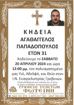 Πλοήγηση άρθρων Τα Γρεβενά θρηνούν το Σάββατο, για τον άδικο χαμό του 31χρονου Αγαθάγγελου Παπαδόπουλου..