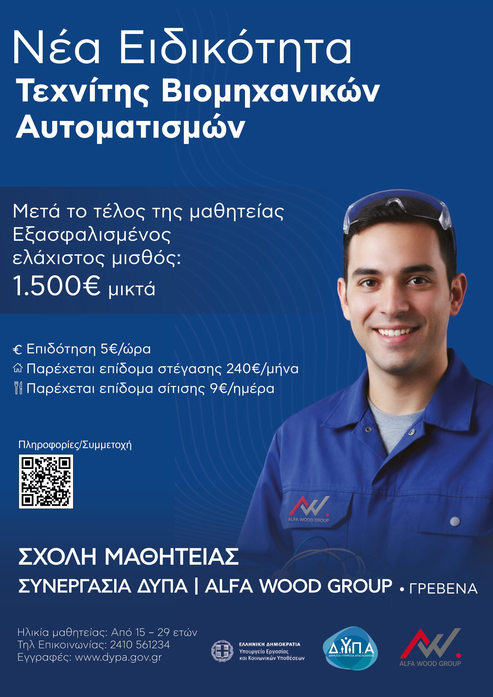 Η Δημόσια Υπηρεσία Απασχόλησης (Δ.ΥΠ.Α.), σε συνεργασία με την ALFA WOOD GROUP Γρεβενών, ανακοινώνει την έναρξη εγγραφών στη Σχολή Μαθητείας για τη νέα και σύγχρονη ειδικότητα «Τεχνίτης Βιομηχανικών Αυτοματισμών».