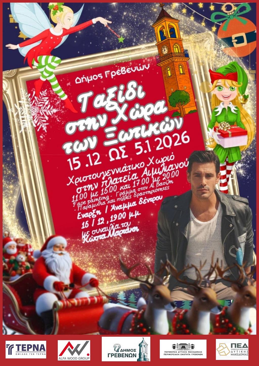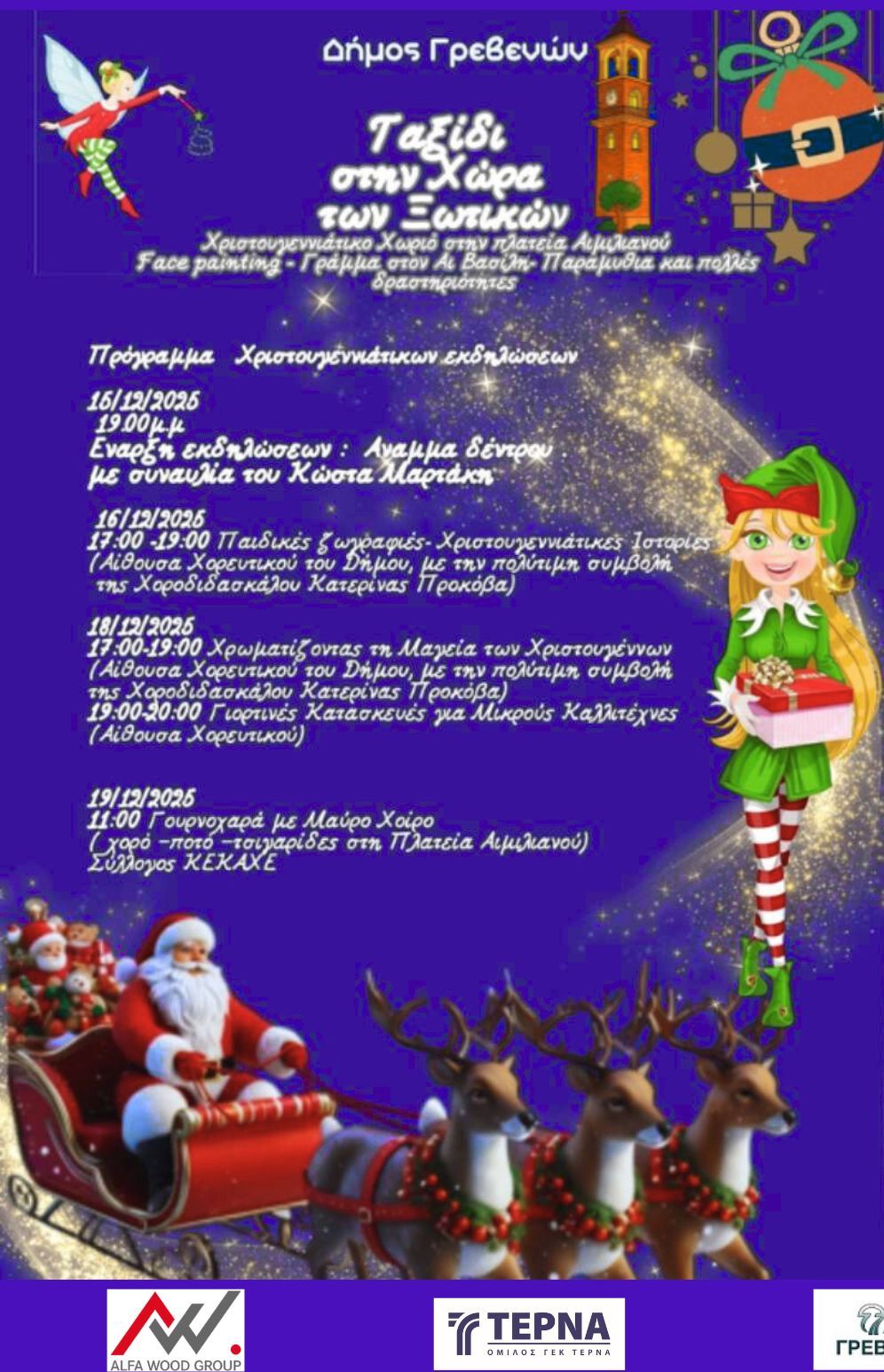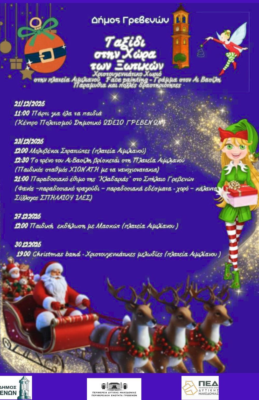 ανοίγοντας την πιο λαμπερή σελίδα των Χριστουγέννων. Ο Δήμος Γρεβενών, σε συνεργασία με την Π.Ε. Γρεβενών και την ΠΕΔ Δυτικής Μακεδονίας, παρουσιάζει ένα αναβαθμισμένο, λαμπερό και βαθιά παιδοκεντρικό πρόγραμμα εορταστικών εκδηλώσεων , ένα «ΤΑΞΙΔΙ ΣΤΗ ΧΩΡΑ ΤΩΝ ΞΩΤΙΚΩΝ»!!!