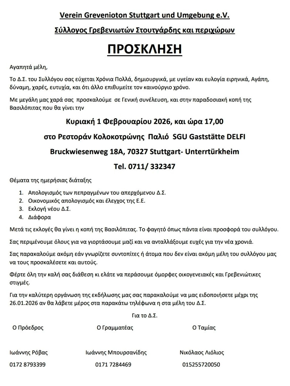 Η εκδήλωση θα πραγματοποιηθεί την Κυριακή 1 Φεβρουαρίου 2026, στις 17:00, στο Ρεστοράν «Κολοκοτρώνης» (Παλιό SGU Gaststätte DELFI) στο Stuttgart-Untertürkheim.