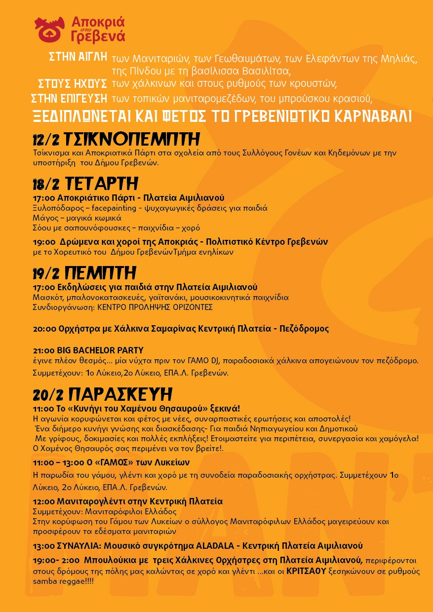 Ένα πολύχρωμο μωσαϊκό εθίμων, μουσικής, χορού και δημιουργικής έκφρασης που συνδιοργανώνουν ο Δήμος και η Π.Ε. Γρεβενών, μετατρέπει την πόλη και τις Τοπικές Κοινότητες σε μια μεγάλη σκηνή χαράς. Η πλούσια πολιτιστική κληρονομιά του τόπου συναντά το σύγχρονο γλέντι, με αναβιώσεις εθίμων, μαθητικές και λαϊκές παρελάσεις, δράσεις για παιδιά, συναυλίες, μπουλούκια, αποκριάτικους φανούς και ατελείωτο χορό.
