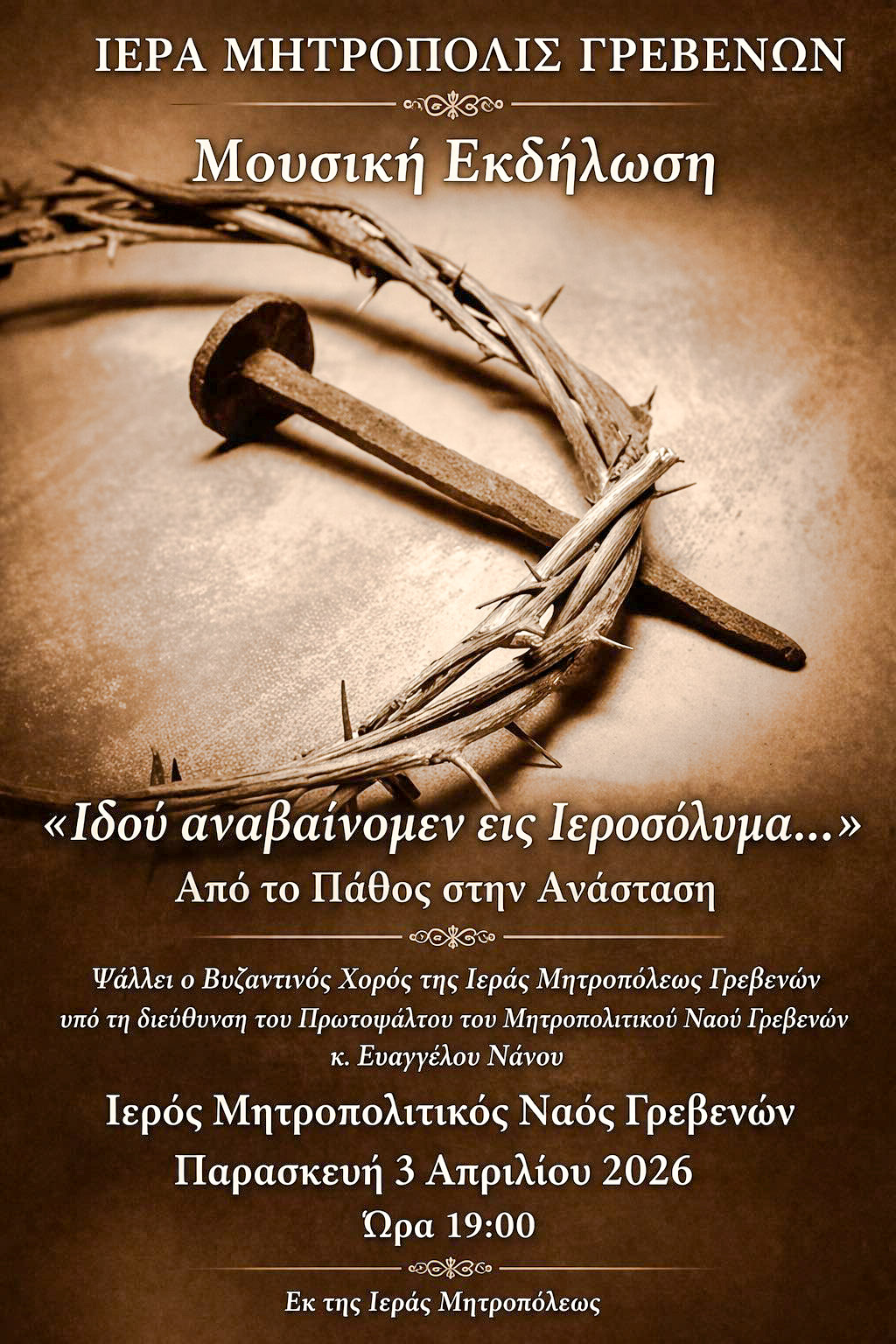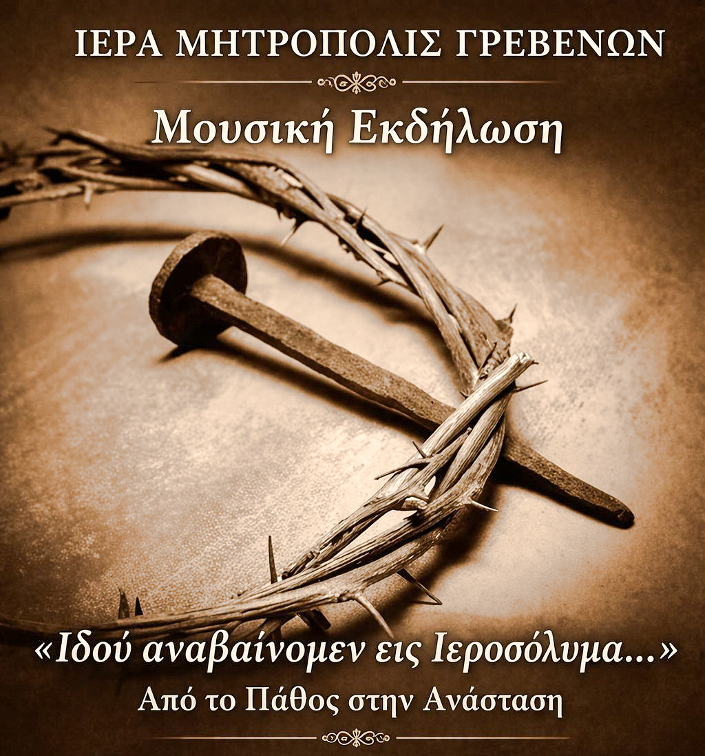 Η Ιερά Μητρόπολις Γρεβενών διοργανώνει μουσική εκδήλωση με τίτλο «Ιδού αναβαίνομεν εις Ιεροσόλυμα…», με θέμα «Από το Πάθος στην Ανάσταση», προσκαλώντας το κοινό σε μια κατανυκτική πορεία μέσα από την ιερά παράδοση της βυζαντινής μουσικής και το βαθύ πνευματικό νόημα των ημερών.