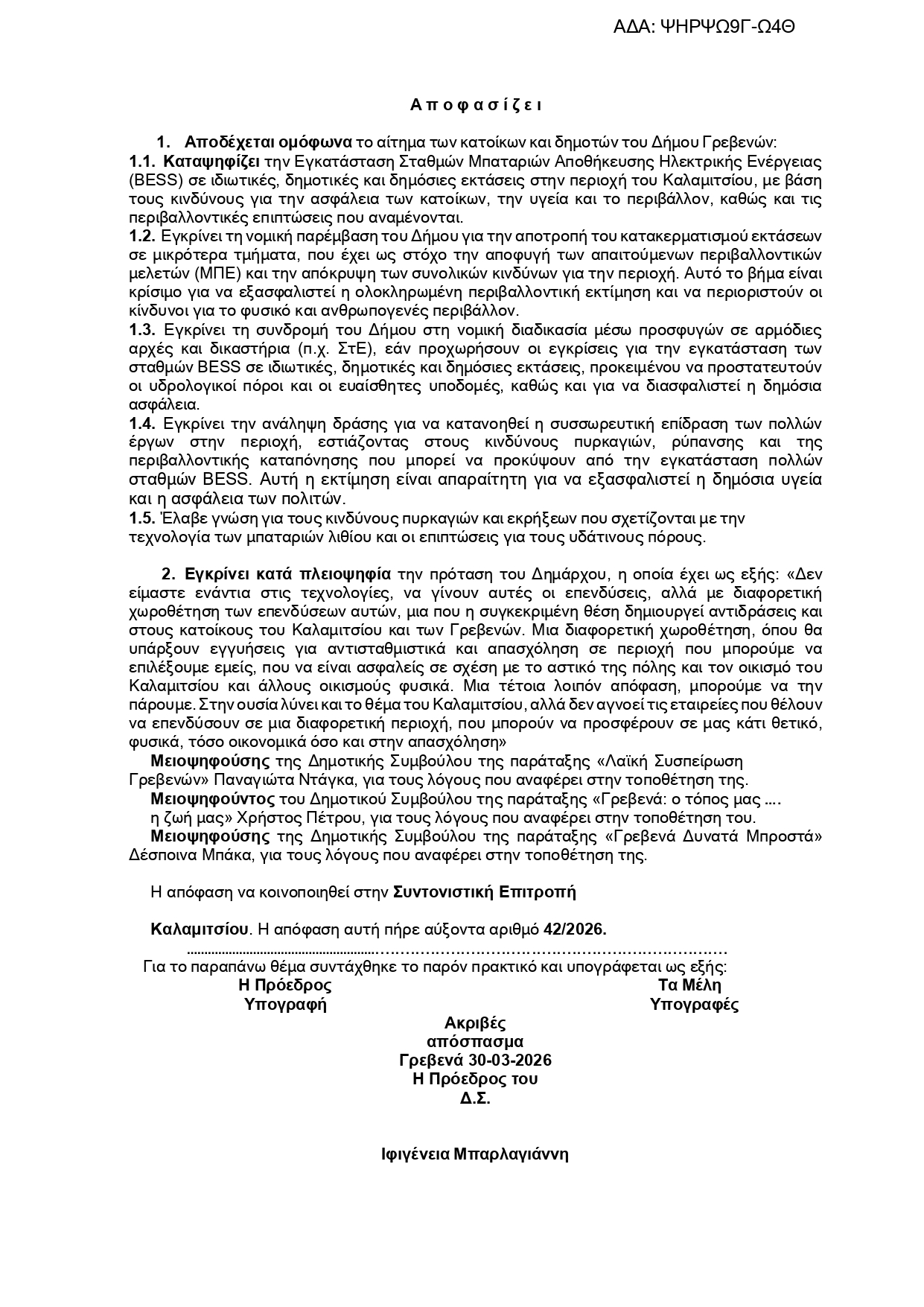 Πράγματι, το Δημοτικό Συμβούλιο, κατά τη συνεδρίαση της 23ης Μαρτίου 2026, αποδέχθηκε ομόφωνα το αίτημα κατοίκων και δημοτών σχετικά με τη μη εγκατάσταση Σταθμών Αποθήκευσης Ηλεκτρικής Ενέργειας (BESS) στην περιοχή του Καλαμιτσίου, εκφράζοντας τις εύλογες ανησυχίες για ζητήματα ασφάλειας, υγείας και περιβαλλοντικών επιπτώσεων.