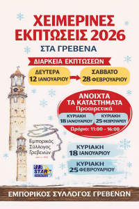 Ο Εμπορικός Σύλλογος Γρεβενών ενημερώνει τους επαγγελματίες της πόλης, καθώς και το καταναλωτικό κοινό, ότι οι χειμερινές εκπτώσεις για το έτος 2026 θα (περισσότερα…)