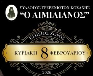 Ο Σύλλογος Γρεβενιωτών Κοζάνης «Ο ΑΙΜΙΛΙΑΝΟΣ», πιστός στην παράδοση χρόνων, ανακοινώνει ότι στο πλαίσιο του ετήσιου χορού του για το 2026, θα πραγματοποιήσει την καθιερωμένη...